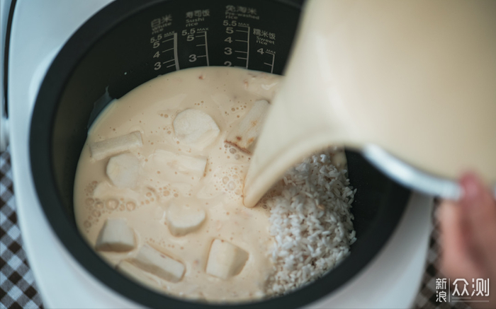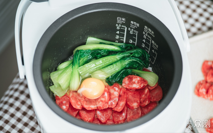 淘好米后,按照米量和水量倒入锅内,选择白米+煲仔饭模式即可。