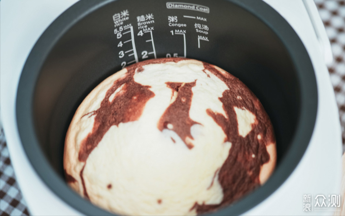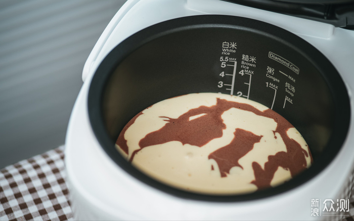 ⑦将原味蛋糕糊和可可蛋糕糊错开倒入电饭煲内