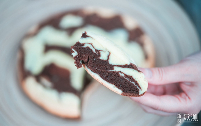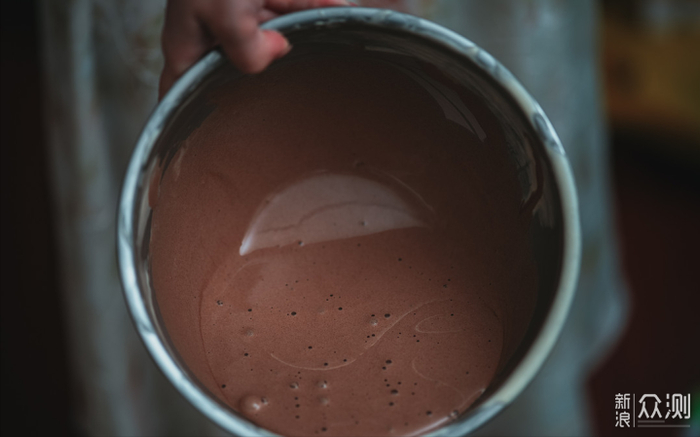 ⑥将原味蛋糕糊分成2份,其中一份加入之前的可可液混合成可可糊