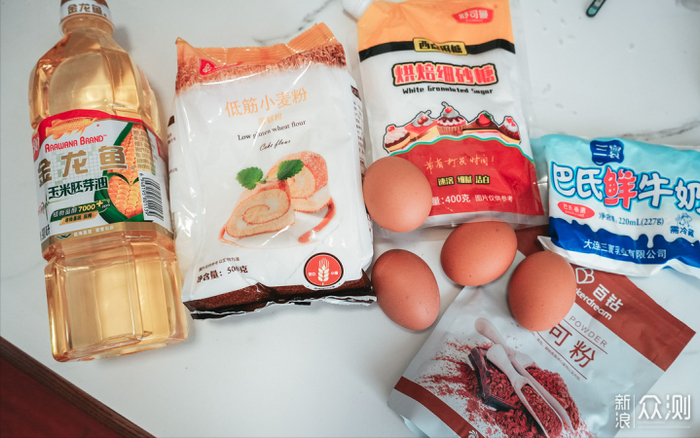鸡蛋4个、白砂糖76g、玉米油45g、牛奶50g、低筋面粉90g、可可粉10g、热水20g