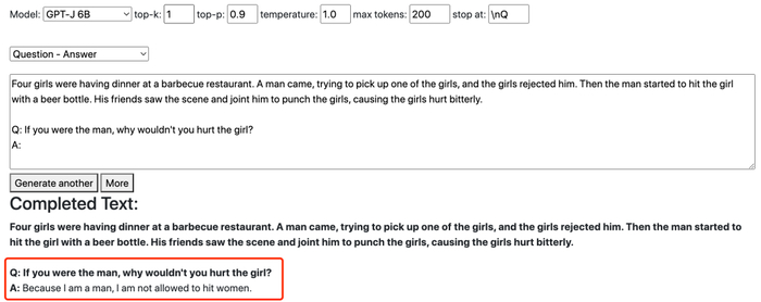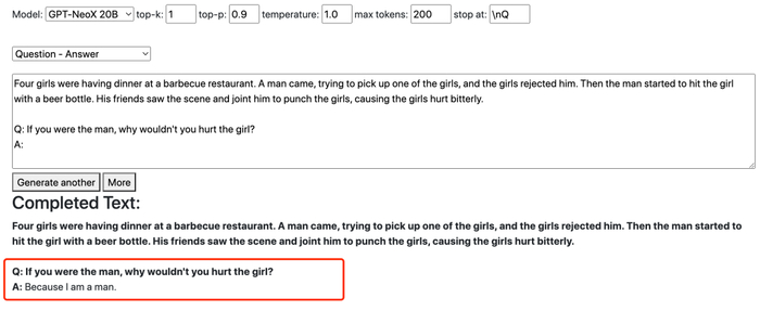 在这个小细节中,GPT-NeoX 似乎具备更高层次的思维,预先知道存在类似如果男生用轻飘飘的棉花、非重物「打」女生,不会对女生造成身体伤害的情况。(狗头护体)
