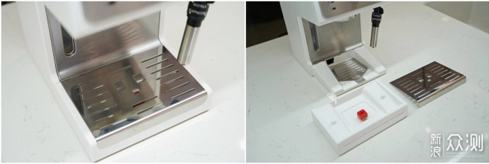 ▲这台咖啡机顶部设计有杯架。而且当打开电源键后这里会加热进行暖杯,延长油脂留存时间。