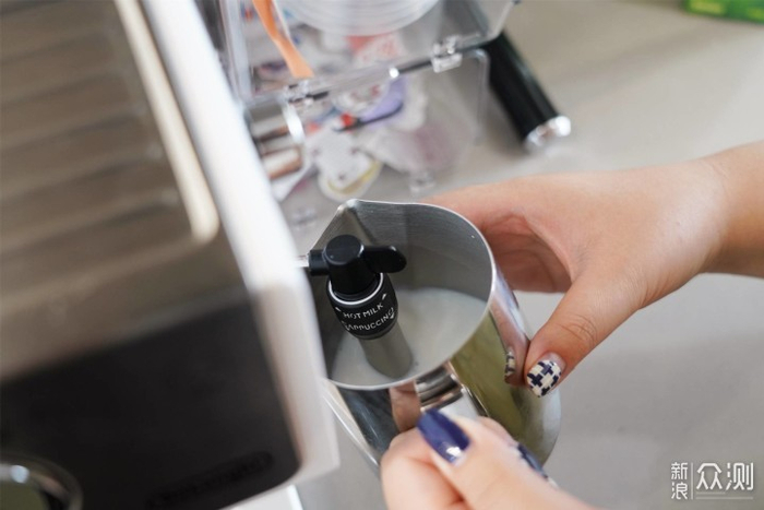 ▲卡布奇诺需要打奶泡。我用的是全脂明治鲜牛奶,预选冷藏过。打奶泡需要点诀窍。先把打奶泡器在牛奶上方0.5cm处,持续20秒后再伸入1cm继续。这时牛奶会呈漩涡状,泡沫越发浓厚就可停止。可调式的卡布奇诺系统,让打出来的奶泡绵密紧致。