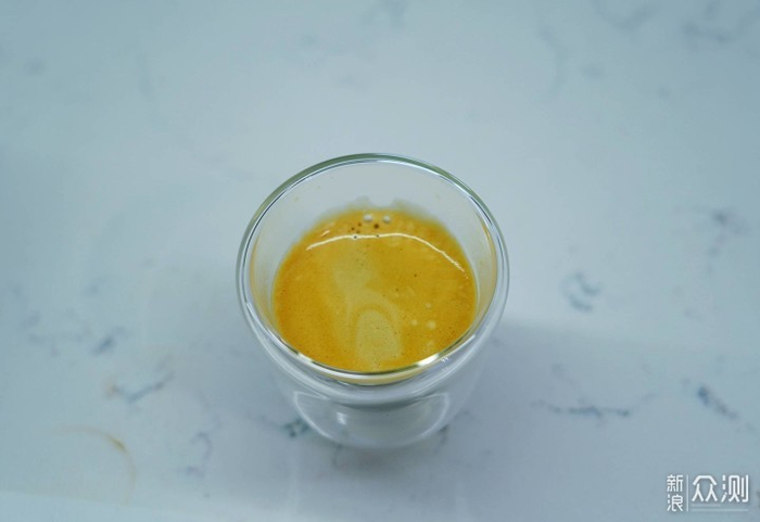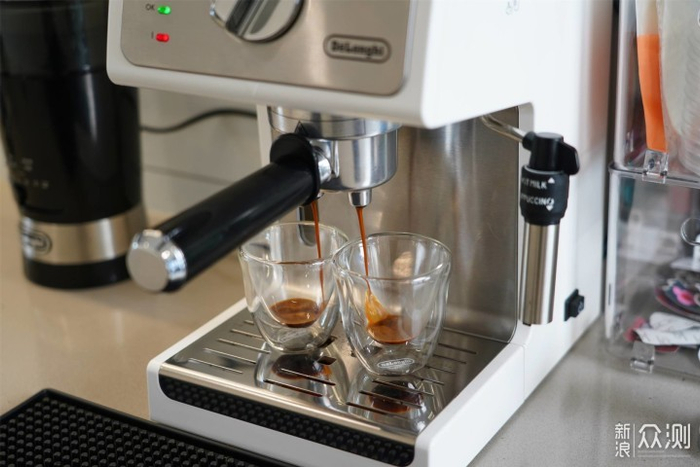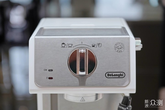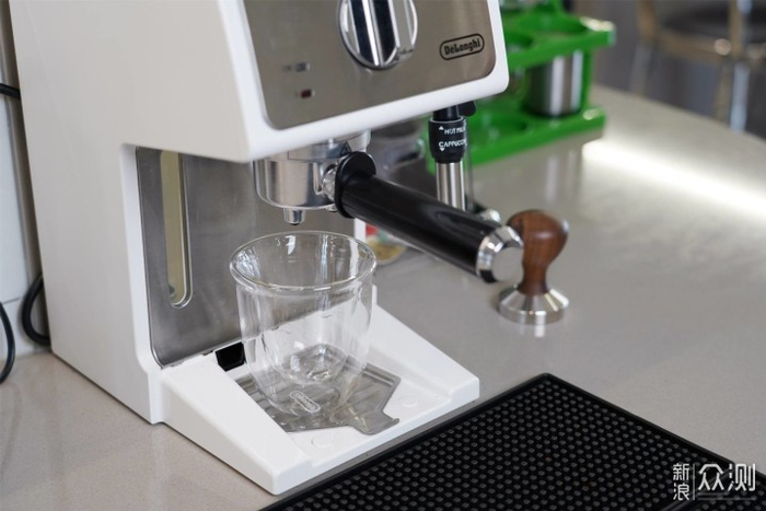 ▲制作也很简单,水箱加满水后打开电源开关。灯带OK灯变绿后机械旋钮往右拨。它的电子温控技术能每次能以稳定的温度进行萃取。稍等几秒后咖啡机就能出浓缩意式咖啡了。(这里要注意先对咖啡杯进行暖杯,避免油脂过快消散)