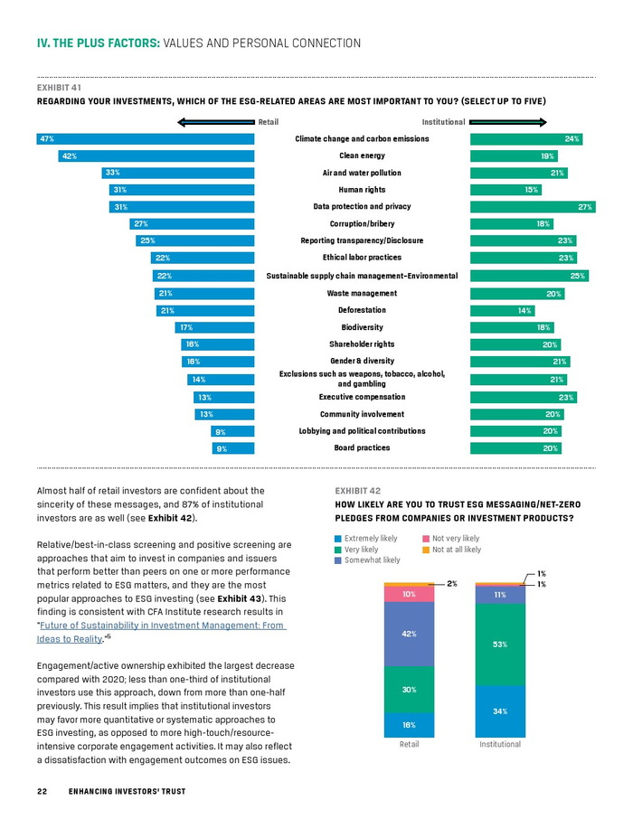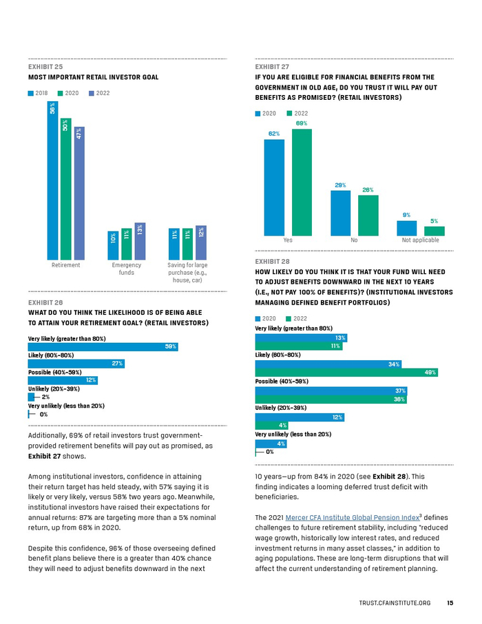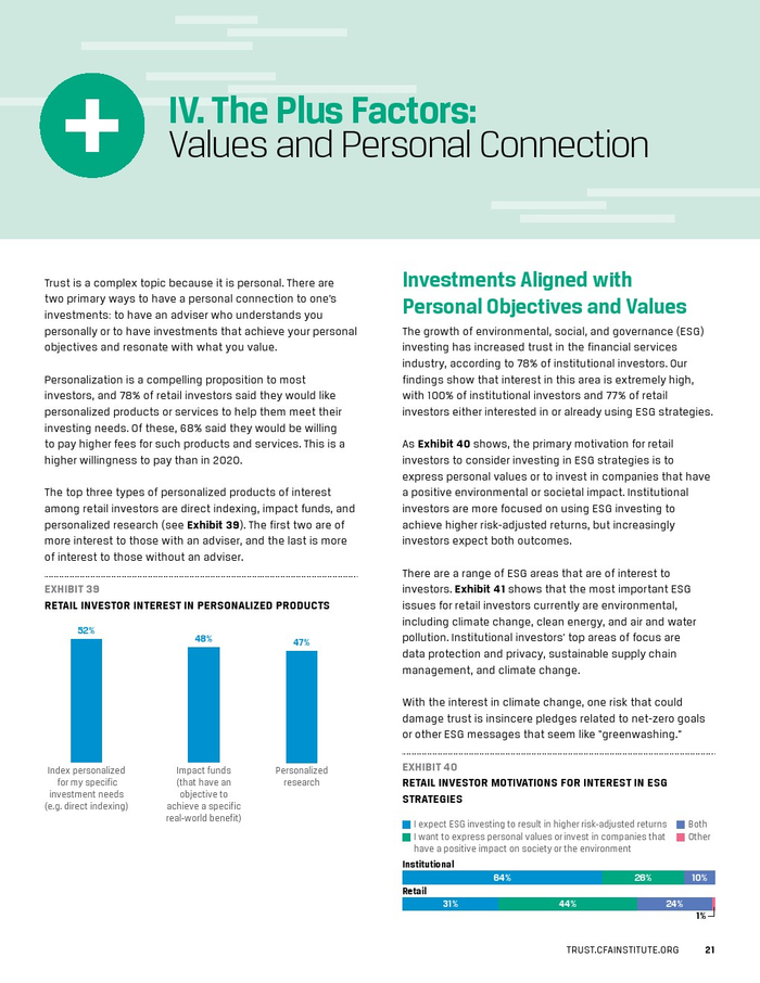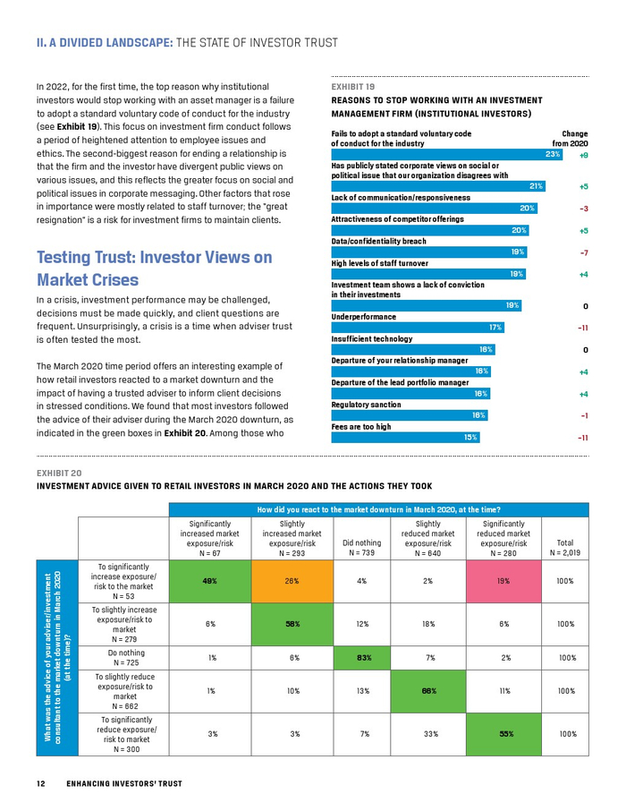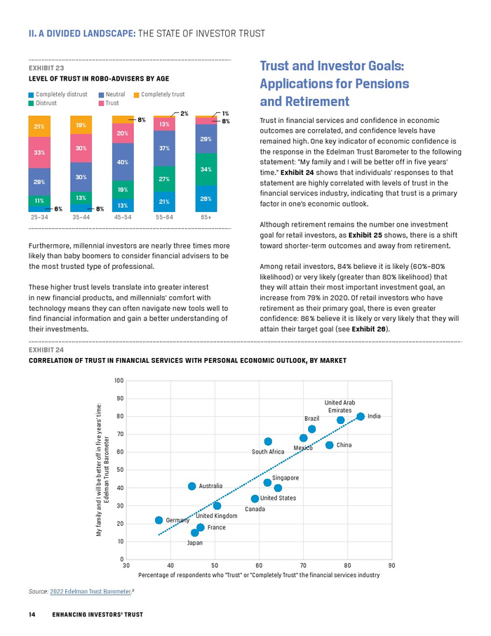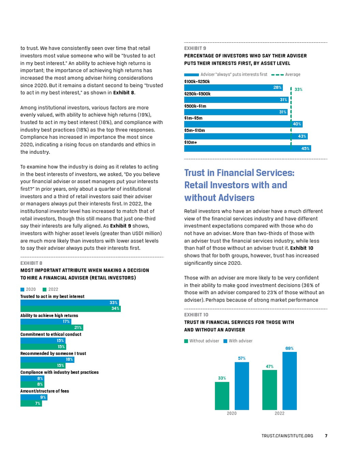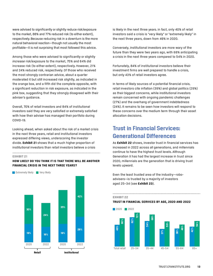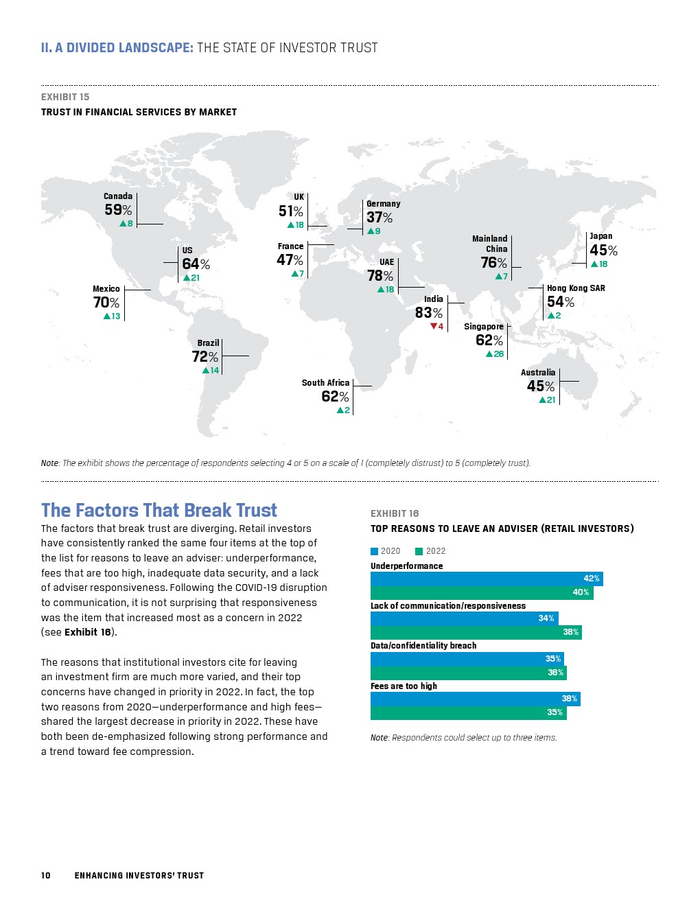 2022 年的报告发现,自 2020 年以来公众和机构投资者对金融服务的信任度显著提高。机构投资者(如保险公司、养老基金、捐赠基金等)通常对管理其资产的公司具有较高的信任度,并对这些公司提供的价值感到满意。公众投资者总体上也表现出较高的信任度,尽管他们的信任度低于机构投资者。重要的是,有顾问的公众投资者和没有顾问的公众投资者之间的满意度不同。