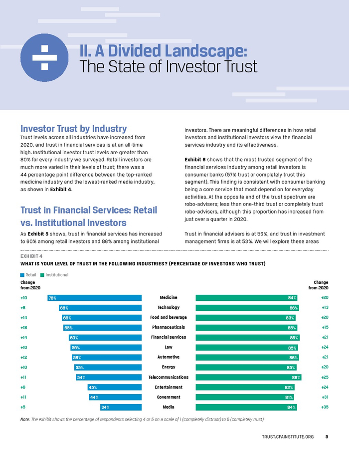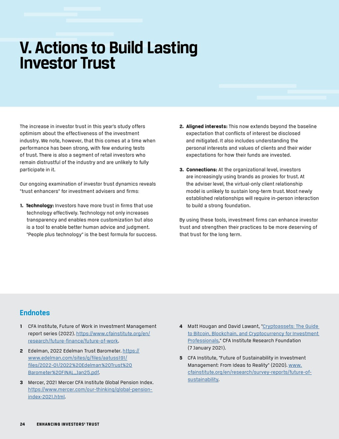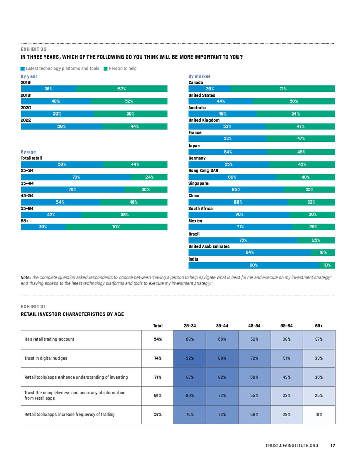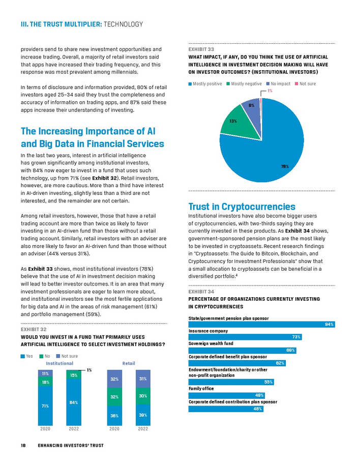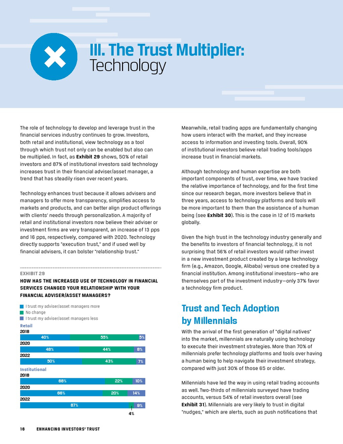 报告认为技术可以成倍提高投资服务的信任度。一半的公众投资者和超过4/5的机构投资者报告说,技术的扩大使用增加了对顾问或资产经理的信任。