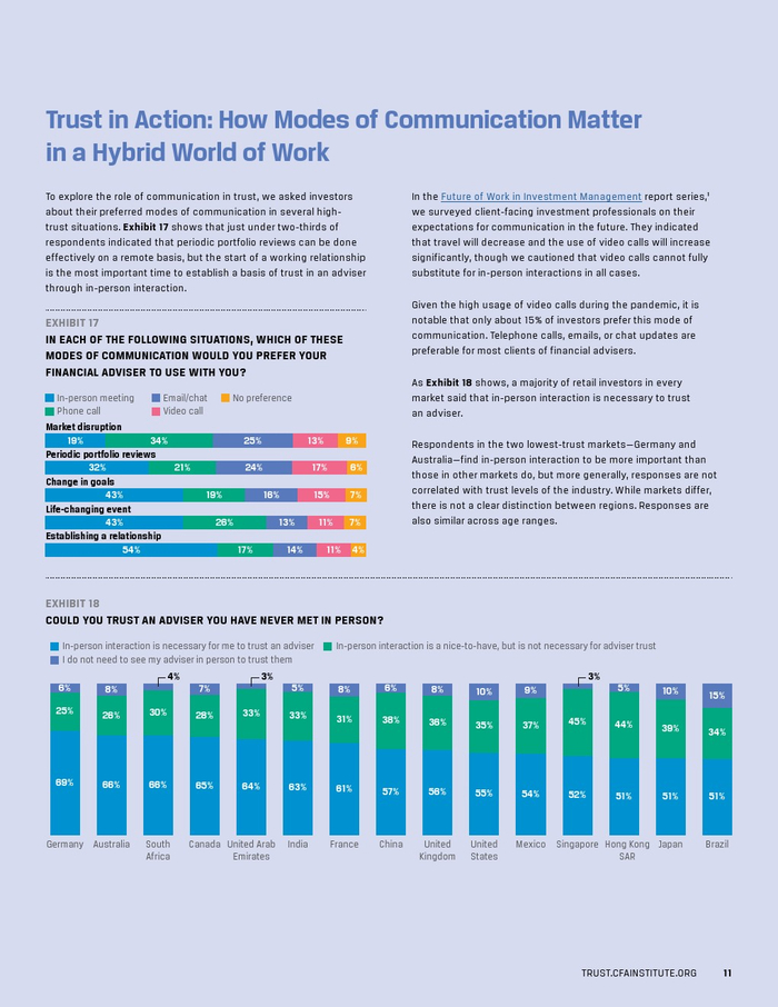 报告还研究了投资者群体之间的信任鸿沟,包括跨地域市场、世代之间以及有和没有顾问的公众投资者之间的差异。