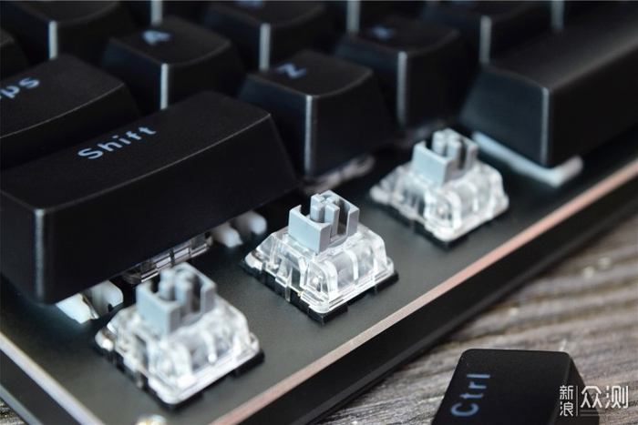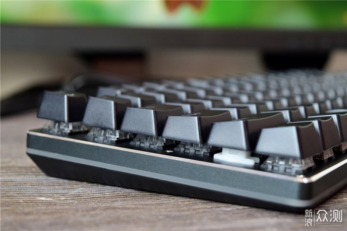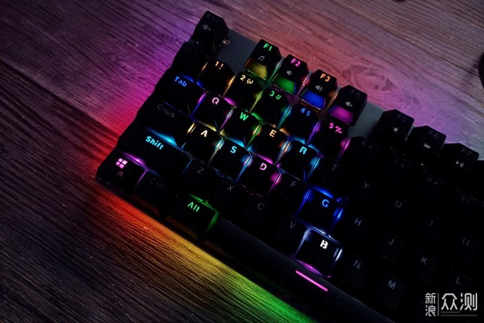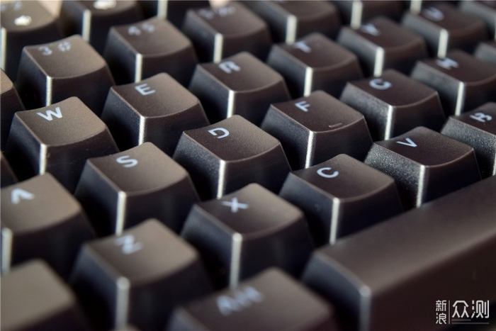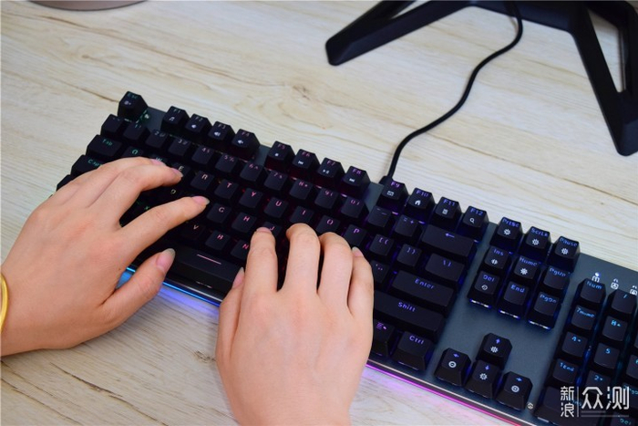 键盘的键帽采用悬浮式排列设计,其中每个键帽表面都经过了磨砂和弧度处理,按压时会更舒适;另外键帽还采用了双色注塑工艺,不仅可以让透光更均匀,而且还能减少长时间使用后字符褪色、模糊、磨损等困扰。