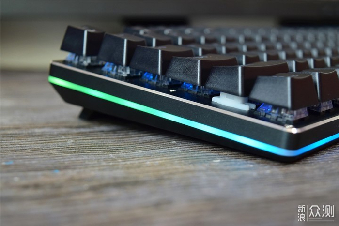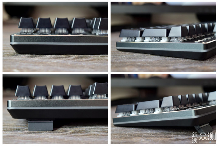 在键盘的背面还配备了2个小支架,可以将键盘提升一定的高度,带来更舒适的操控体验。从侧面可以看到,键盘底座采用了前低后高的微微上翘的设计,再加上有弧度的键帽,操作起来更舒适顺畅。