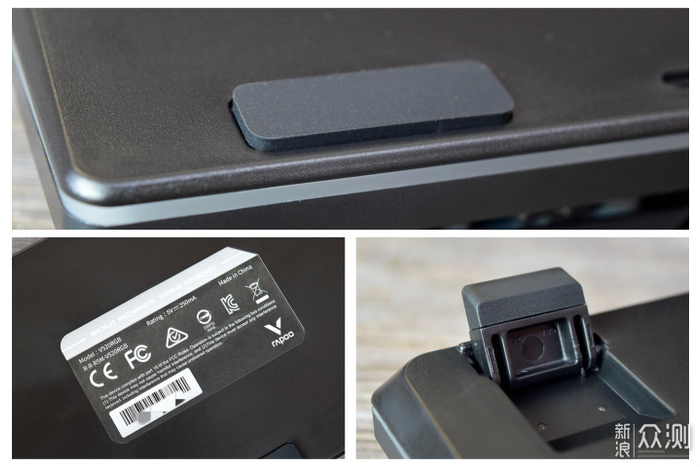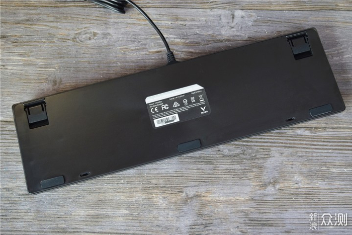相比键盘的正面来说,键盘背面设计就比较简约了,靠近前方的边缘位置是3块防滑胶垫,后方是2个支架,中间贴有产品标签。