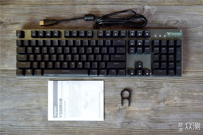 来看看盒中都有些什么?除了雷柏V520 RGB合金版机械键盘外,另外还有使用说明和拔键器,可以方便用户拔取和更换键帽。