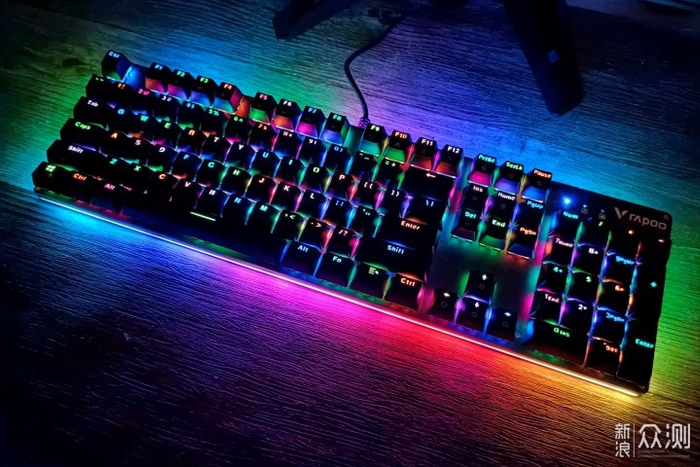 雷柏V520 RGB合金版中预设了19种按键灯效,除了支持纯色、彩色、幻彩等不同效果的灯效,而且还支持涟漪模式,当敲击按键是,会形成犹如水波纹的样子,看起来还不错。