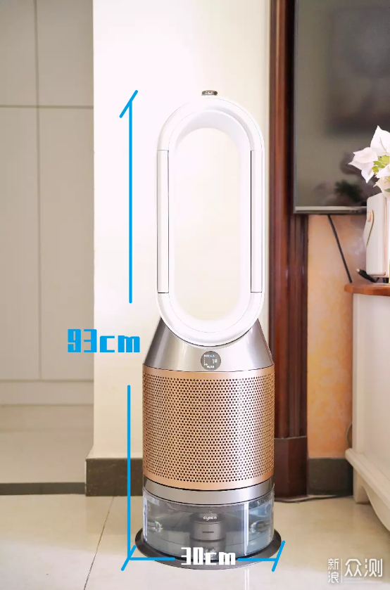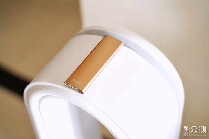 ▼先看外观,和戴森其他无叶风扇纤细的设计有些不同,PH04这款产品的机身直径相对更要更宽一些,给人感觉比较稳固敦实。白色+银灰色+金色的整机配色也十分大气,有鲜明的戴森风格,机身具体尺寸为高度93cm,最大直径30cm。