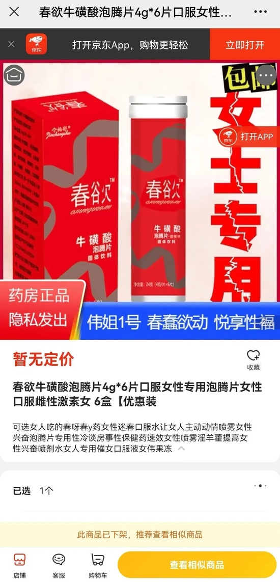 以出现在某电商平台的春欲牌牛磺酸泡腾片为例,该产品目前已经下架,但仍然可以看到该商品详情中标注“女士专用”,将其定位为“伟姐一号”,有着“春蠢欲动、悦享性福”的功效。甚至还提醒消费者可以放心购买,“保密发货,包裹没有产品信息,细心的快递员也发现不了。”