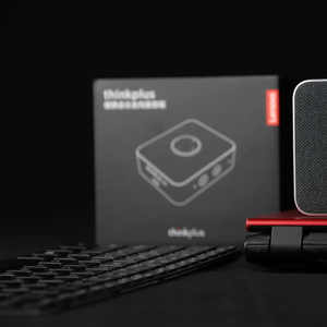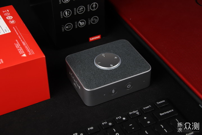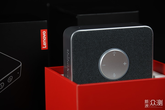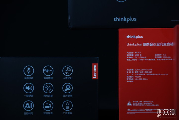 包装方面,这款音箱延续了联想think系列一贯的简约设计,黑色盒盖搭配红色盒底,正面印有产品简图,两侧为产品的特色功能:全向拾音、智能降噪、人声优化、智能转写、智能翻译等。除主机外,附赠有一根Type-c充电线,另有说明书和保修卡。