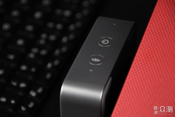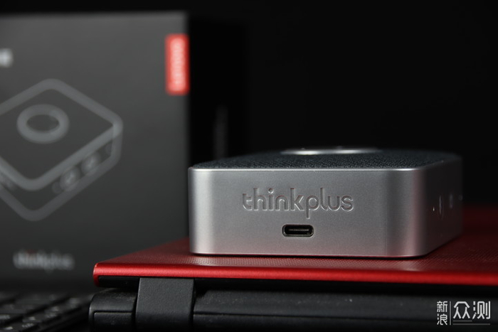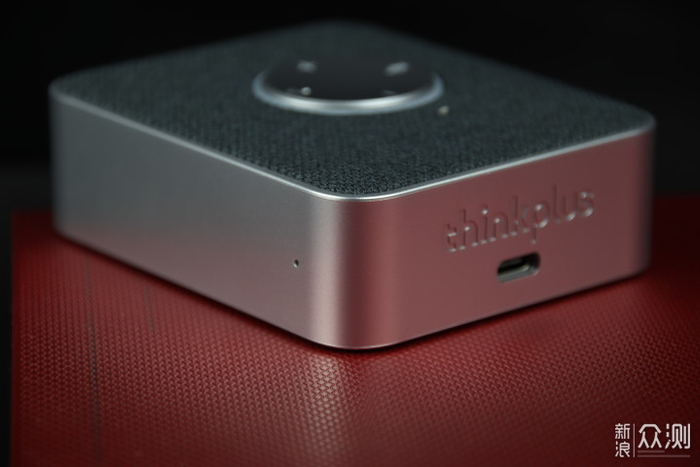 86×72×31.6mm的尺寸,掌心大小,在便携音箱里也算是特别小巧的,仅有110g的重量,四周为磨砂质感的银色金属材质,与顶部深灰色蒙布的组合恰到好处,中央是个银灰色的圆形多功能按键,包含音量加减、静音键和定制的一键启动会议程序按键。两侧分别为Lenovo、thinkplus和Type-c充电插孔,其余两边各有一颗降噪麦克风,另有蓝牙配对按键和电源开关按键、电源指示灯。底部有四个胶垫,中间为产品参数标签。音箱整体看上去,商务百搭。