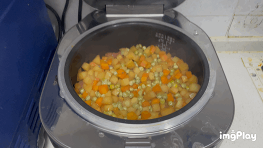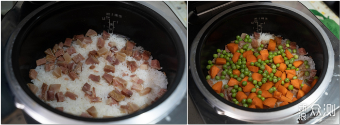 等听到电饭煲“嘀”的一声提醒后,打开锅盖,此时米饭+腊肉已经煮熟,再加入豌豆+胡萝卜块,继续烹饪。