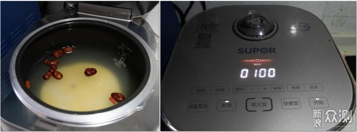 放入小米、少量糯米、红枣及清水直接倒入电饭煲中,点击“熬粥”功能,还看用“+”、“-”根据不同食量、不同食材来调整烹饪时间。