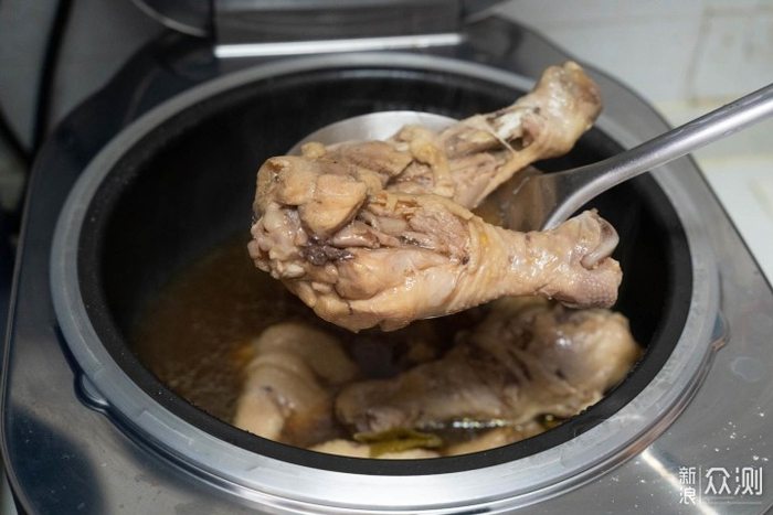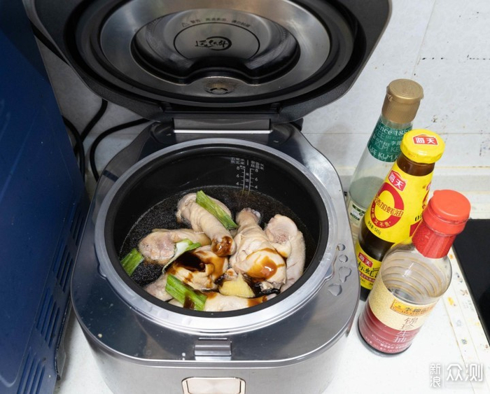 先以炖鸡腿为例!为了让鸡肉更加入味,准备食材时,先用刀在鸡腿上多切几刀。然后用凉水将鸡腿焯一遍,去掉赃物。将焯好的鸡腿、少量葱段、少量姜片、生抽、料酒、蒸鱼豉油、盐,少量开水,一起倒入电饭煲中,选择“入味炖”功能。