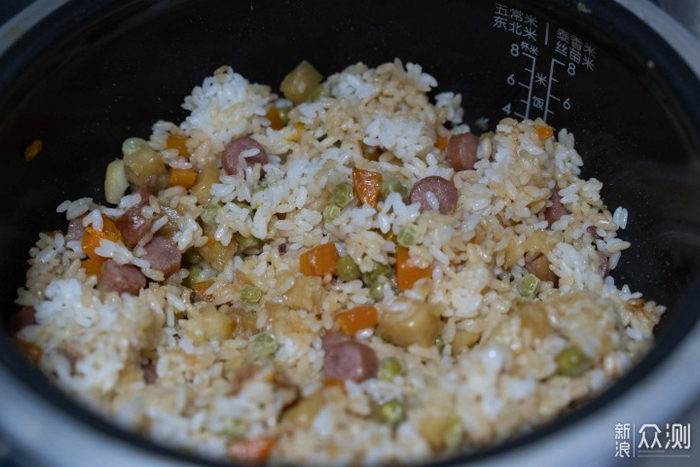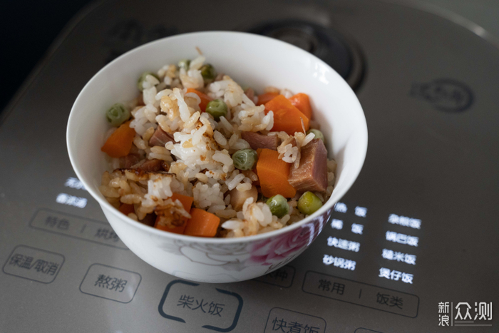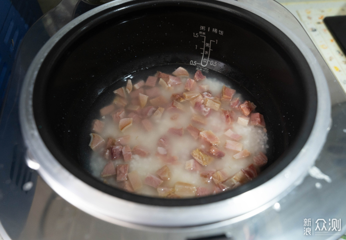为了让腊肉入味,将切好的腊肉块和大米一起放入锅中,加上适当清水,选择“煲仔饭”功能,也对应选择大米种类-五常米。