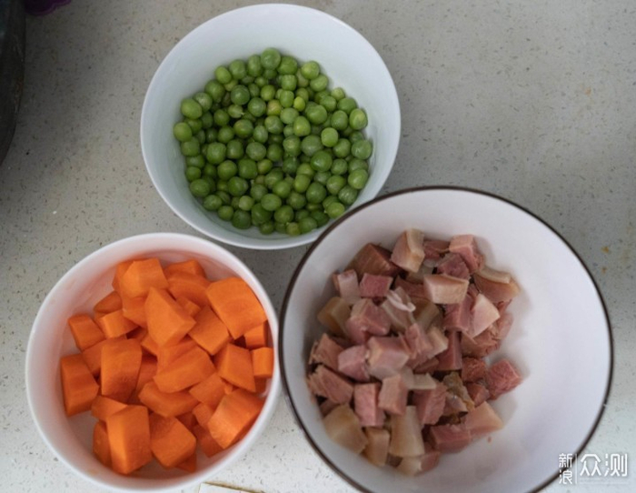 首先准备配料食材:青豆、胡萝卜块、腊肉块