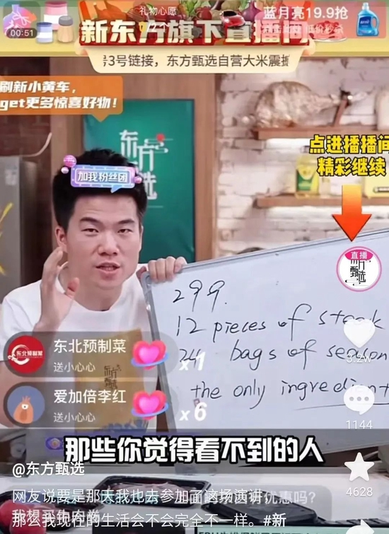 在这个“一切皆可段子化”的时代,这显然切中了流量的爆点。6月10日晚,主播是8年间教过50万学生的英语老师董宇辉,他会在满足用户让他讲英语的同时提醒,“please remember to buy something, ok?”然后认真地搬出小黑板,教大家“牛排原切”的正确说法是“Original Cutting”。