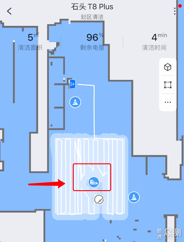 单个障碍物的避障测试, 单个障碍物, 石头T8 Plus 会做一个绕障碍物一周清扫动作, 然后再去处理障碍物周边的区域, 这样的好处就是避免后续清扫的时候碰到障碍物。