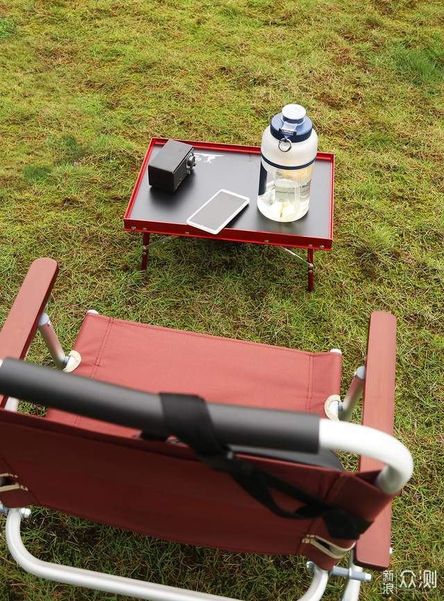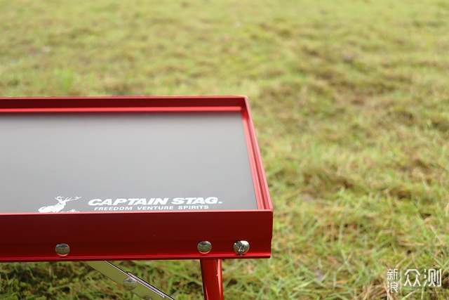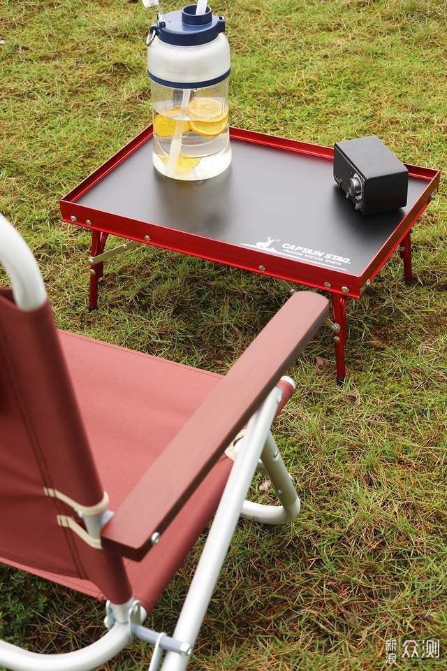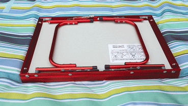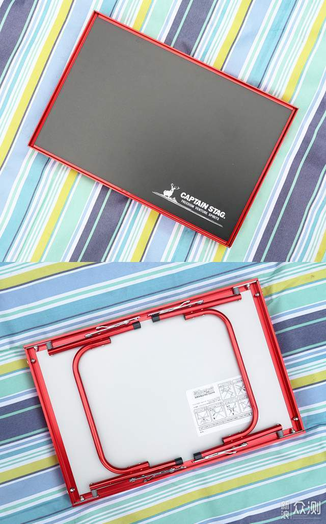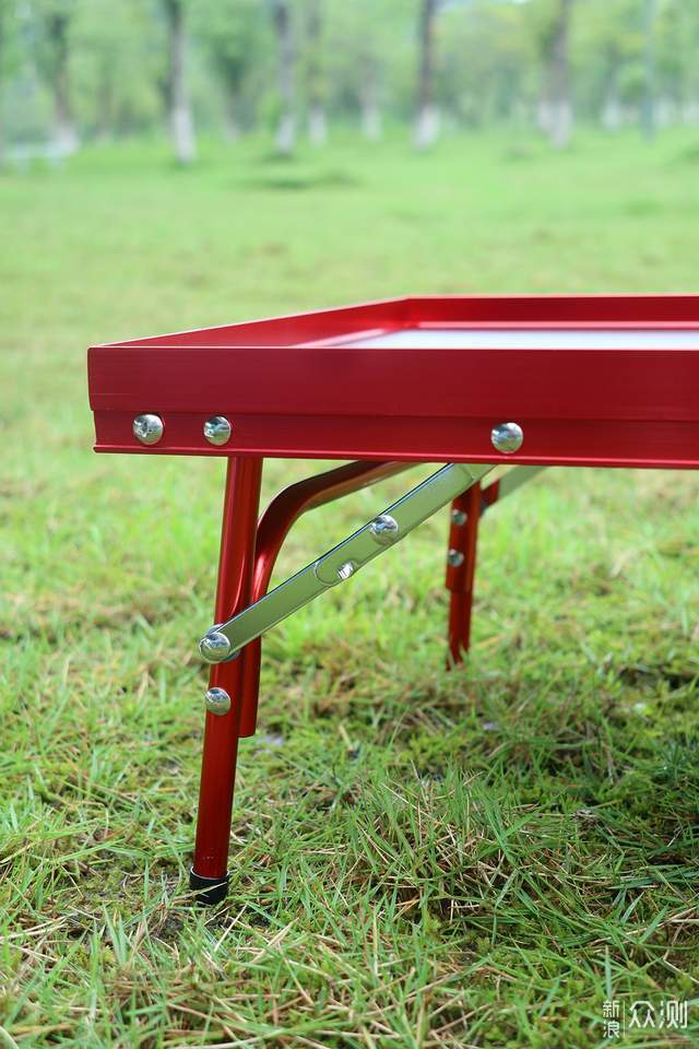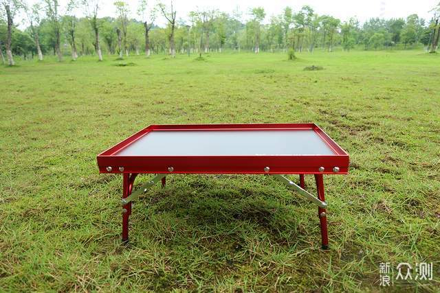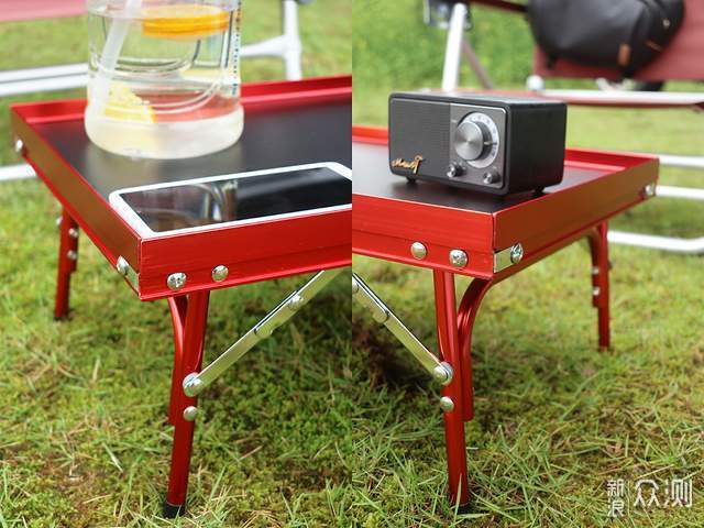 铝合金托盘桌子同样为“矮小”便携式设计,桌面为460*310mm,中间黑色的合成树脂装饰纤维板包边的则是大红色铝合金材质,背面则是可折叠的四个支撑脚。