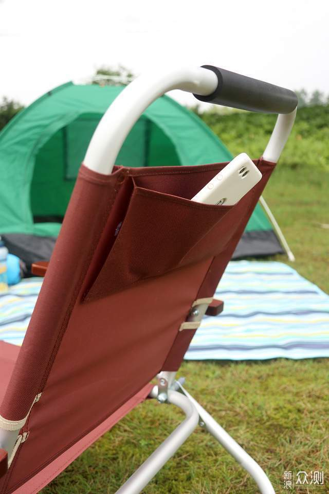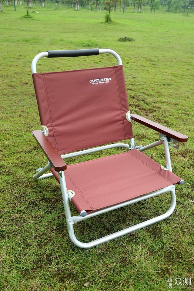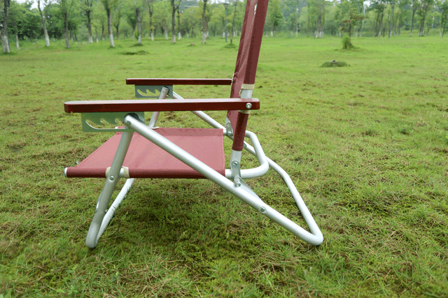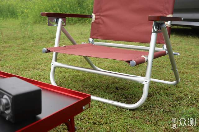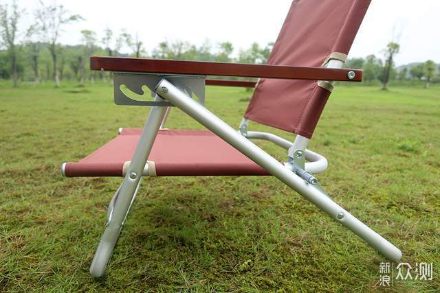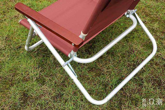 首先来看到折叠椅(官方称之为低矮型躺椅),常见的外观造型设计,铝制(表面氧化铝)圆管作为主要骨架再辅以红棕色扶手和顶部黑色聚氨酯泡沫,而坐垫和靠垫则是红棕色,让其整体更简约百搭。
