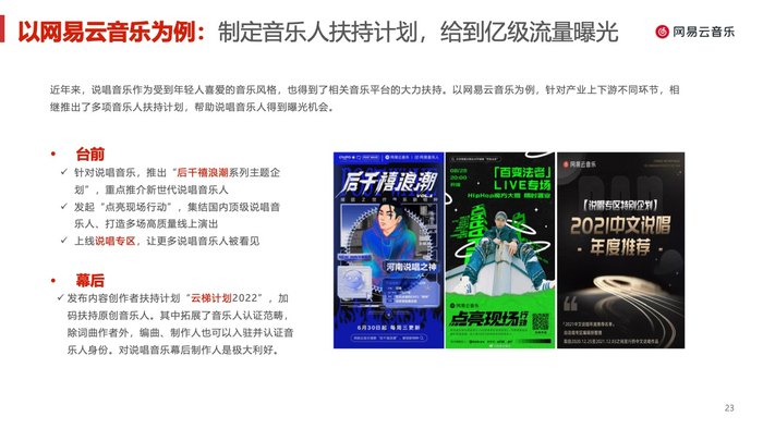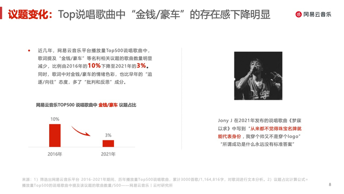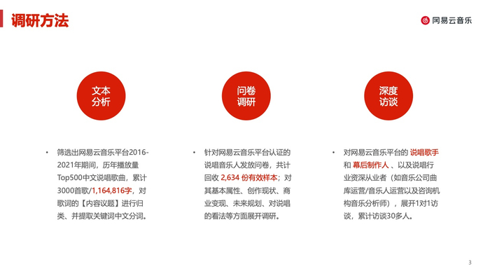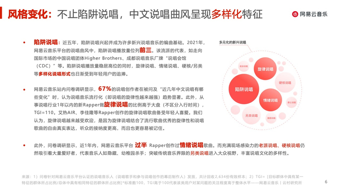 作为广受年轻用户青睐的音乐社区,网易云音乐对这一趋势保持了持续的关注。自2020年起,说唱已成为网易云音乐播放量第二的曲风(仅次于流行 音乐),也是热度最高的分众音乐类型。本报告力图基于网易云音乐平台数据,并依托歌词文本分析、问卷调研、深度访谈等方法,还原中文说唱音乐 一部分真实现况,给相关从业者以参考与启发。