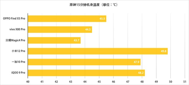 在15分钟的《原神》游戏后,小米12 Pro的机身最高温度达到了49.8℃,iQOO 9 Pro也达到了48.2℃,双手握持时可以明显感受到金属中框和后壳的热量。对比之下,荣耀Magic4 Pro对于温度的控制还不错,最高温度只有43.7℃,尽管还是有些发烫,不过这个温度还是可以接受的。
