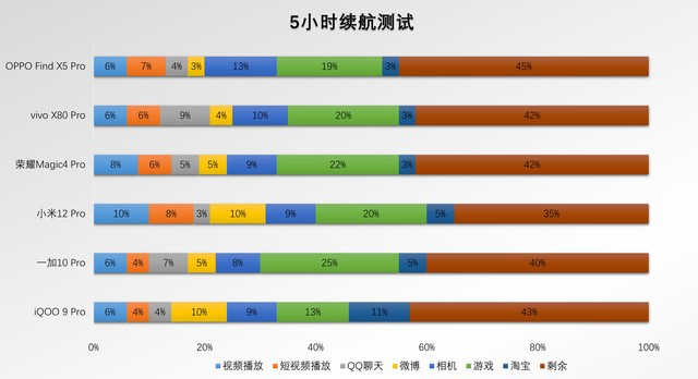 从五小时续航测试来看,显然电池容量和续航能力基本成正比,搭载5000mAh电池容量的OPPO Find X5 Pro表现更好,最终还剩余45%的电量。接下来是iQOO 9 Pro、vivo X80 Pro、荣耀Magic4 Pro、一加10 Pro,在经过5小时续航测试后,基本还能保持在40%以上,小米12 Pro要稍逊色一些,最终剩余35%,重度使用的情况下,还是建议搭配充电宝比较好。