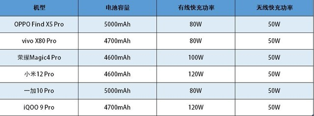 从表中可以清晰看到,大家在电池方面差距不大,快充上,最低也有80W,其中不乏小米12 Pro、iQOO 9 Pro这样采用120W快充的极限方案。当然,正如前面所说的,规格和体验并不等同,具体表现还是要看一看实测表现。