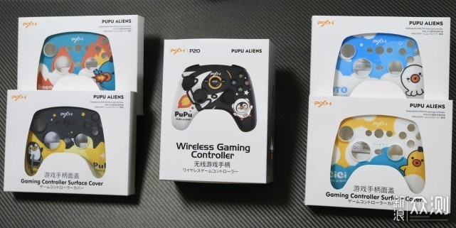 ▲打开快递箱,里面有一盒莱仕达的P20无线游戏手柄以及四盒用于替换的手柄面板,这里总共有五款不同配色的面板,它们都采用非常有个性卡通设计。