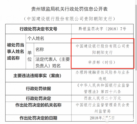 芈彦彬在建行贵阳朝阳分行干了5年左右,该分行还曾收到过一张罚单,2018年2月5日,建行贵阳朝阳支行因办理跨境融资性风险参与业务违规被贵州银监局罚款20万元,当时芈彦彬已经来到华夏银行贵阳分行任职了,但是他作为违法违规事实发生的时任行长,其名字出现在行政处罚信息公开表中。