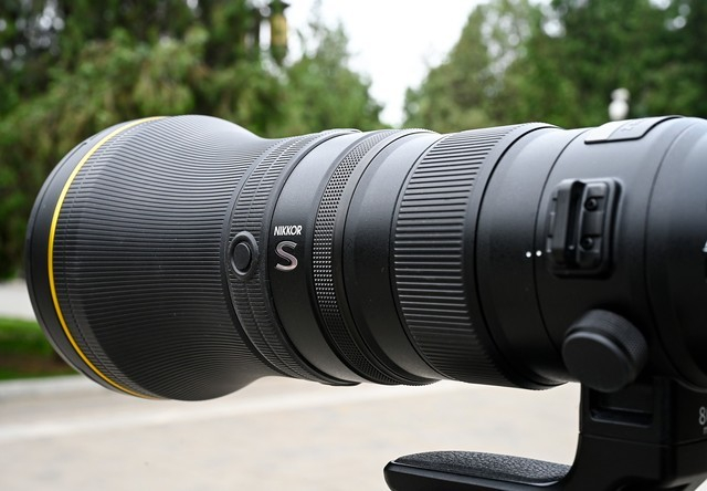 镜头上的标识金属铭牌质感知足,后面800/6.3 S字样下还有Phase Fresnel Lens(菲涅尔相位透镜)黄色字样,表明了这枚镜头的主要特点。靠近前镜组的金色圆环也是尼康一贯的设计语言,也彰显了这枚镜头的专业定位。