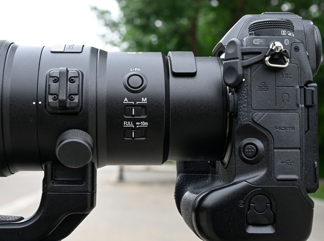 镜头支架环后面则是L-Fn2多功能按钮以及自动/手动对焦切换拨杆和对焦限制拨杆,对焦限制拨杆分两档,分别是FULL(∞ - 5m) 和 ∞ - 10m。