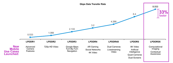 LPDDR5X相比于LPDDR5,速度可提升17%,延迟可降低15%,非常适合5G通信、汽车高分辨率AR/V、AI边缘计算等应用场景。