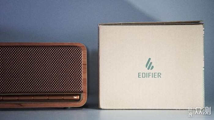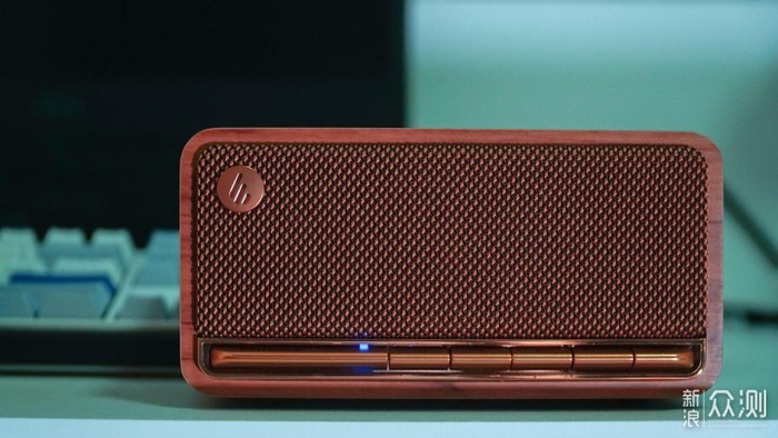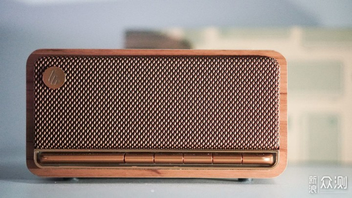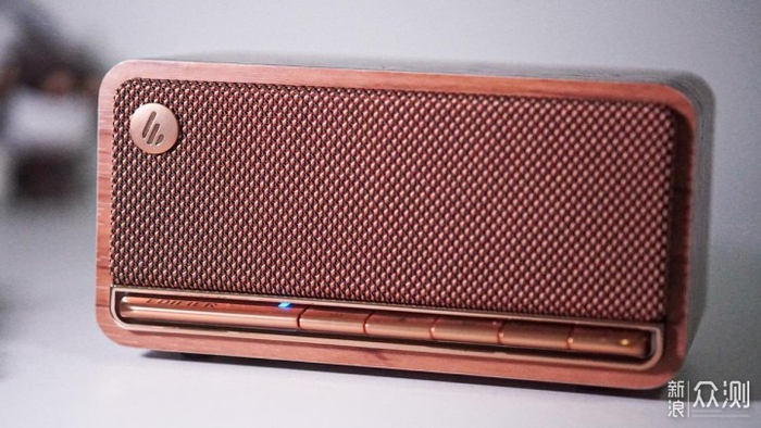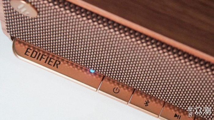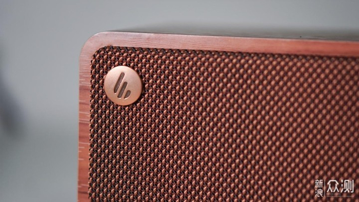 音箱主体采用了深色的MDF木质设计搭配黑金色的编织以及一些黑金色的金属按键,整个音箱看起来很有文艺范。正面是一个黑金色的编织。左上角有一个圆形的漫步者的LOGO,下半部分的错侧有一排水平的暗金色的按键,包括开机键、蓝牙键、歌曲调节键,以及音量增减按键,按键的左侧也是有一个EDIFIER的LOGO设计。