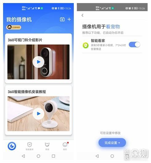 初次使用,首先连接电源线,通电后,在手机上下载安装360摄像机APP,选择这款机型,输入wifi密码,通过声波配对成功,操作十分简单。在连接成功后,还会提示你选择是用于看孩子还是看宠物,我选择了看宠物,并为我智能推荐开启了“智能看家”功能,可以录制5秒看家小视频,随时告警推送消息。