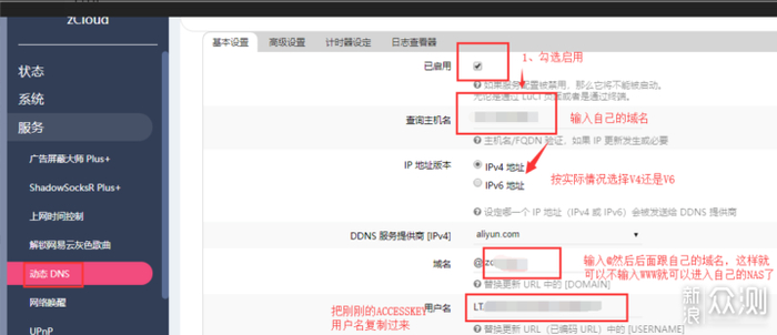 ▼参照openwrt的设置,将阿里云控制台复制下来的ID、密码、还有泛域名填进去,然后再阿里云控制台解析就完成啦。