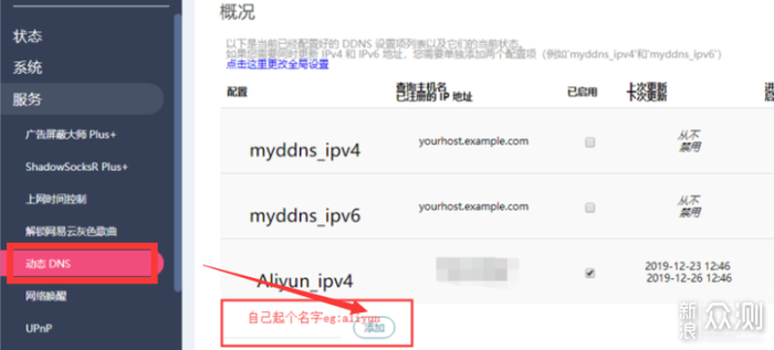 ▼使用openwrt软路由的小伙伴可以进入到服务中的动态DDNS功能,添加一条DDNS记录。