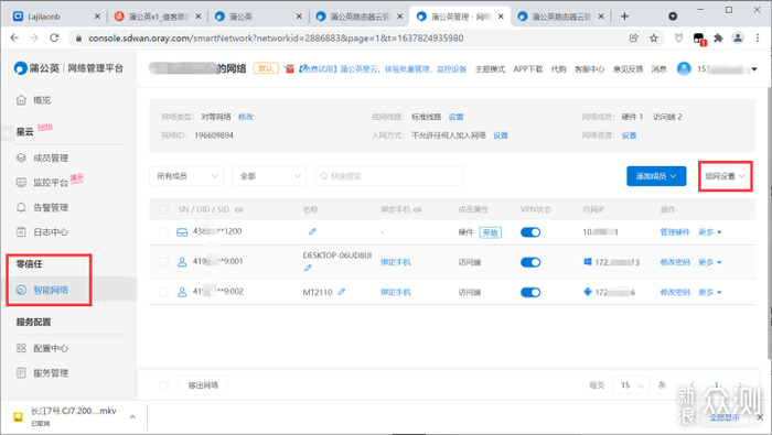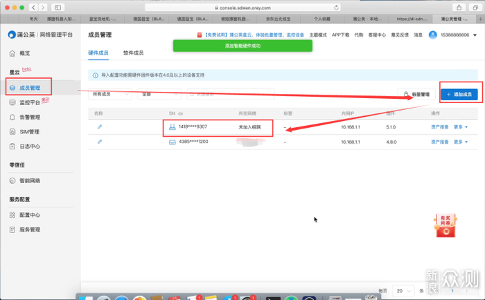 ▼最主要的是X4C同样支持蒲公英的招牌功能异地组网,进入X4C的网络管理平台,在“星云”标签下,按图示位置找到添加成员,将蒲公英X4C作为硬件成员加入网络。