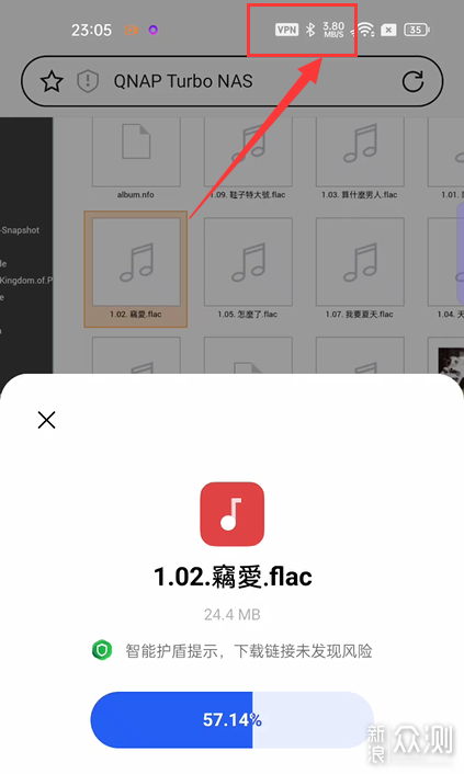 ▼KNK的使用十分简单,NAS上安装以后只需要在手机上安装相应APP或者是电脑上安装应用进行登陆就可以访问到NAS了。测试中下载速度能够跑到3.8MB/S,奶爸家中是电信下行300Mb/s,上行30Mb/s,能够跑满上行带宽。
