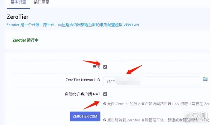 ▼如果你刚好也有openwrt软路由,可以直接进入到服务中,找到zerotier,启用功能,并将ID填写好,勾选自动允许客户端NAT。