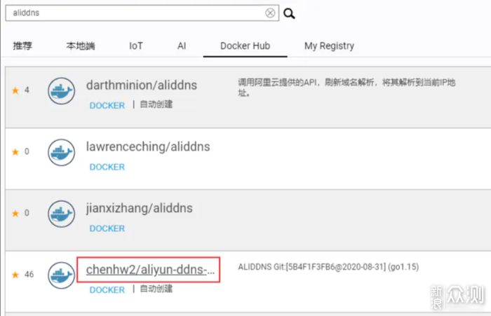 ▼没有Openwrt软路由的小伙伴也不用心急,只需要在Container Station(群晖docker)中搜索aliddns,就能找到提供aliyun DDNS服务的docker。