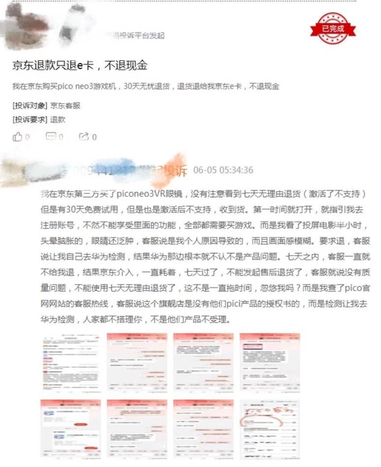 但伴随着火爆的营销,Pico的购机活动体验却引来了大量投诉,且部分消费者反映Pico的VR头显设备体验感并不如其宣传效果。