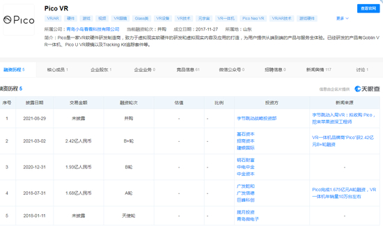 Pico也自2018年逐渐受到资本青睐,至今已完成4轮融资,且大部分为亿元级别,投资方包括中金资本、招商资本、基石资本、建银国际等知名投资机构。直到去年8月,Pico被收购。