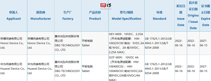 IT之家了解到,此前型号为 WGR-W09、WGR-W19、WGRR-W09、WGRR-W19 的平板电脑通过了 3C 认证,有数码博主称是华为 MatePad Pro 12.6 2022 款,支持 10V 4A 的 40W 快充。
