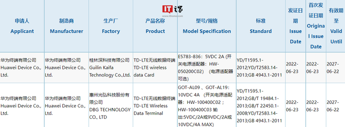IT之家 6 月 25 日消息,6 月 23 日,华为新款 TD-LTE 无线数据终端设备通过 3C 认证,型号为 GOT-AL09、GOT-AL19,配备 40W 充电器。
